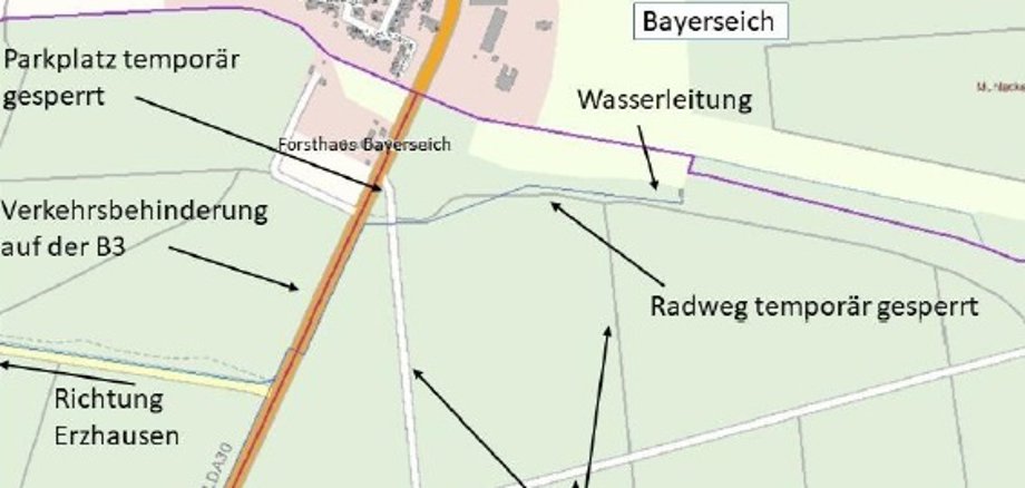 Während der Bauzeit, die nach Angabe von Hessenwasser Mitte Dezember ab-geschlossen sein soll, kommt es sporadisch zu Verkehrseinschränkungen auf der B3, da zeitweise eine Spur gesperrt werden muss. Der Waldparkplatz ge-genüber dem Forsthaus Bayerseich wird für die Dauer der Maßnahme gesperrt sein. Für die Nutzung der Waldwege östlich der B3 werden Hinweise zur Umlei-tung für Radfahrer und Spaziergänger eingerichtet Im Wald kommt es während der Maßnahme zu Baustellenverkehr (siehe Karte).